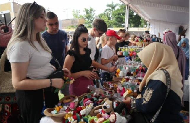 Kegiatan Souvenir Shopping, yang merupakan rangkaian B-TIFF, digelar di alun-alun Bojonegoro, Rabu (24/07/2024). Tampak puluhan stand UMKM dipenuhi oleh ratusan delegasi 8 negara serta masyarakat pengunjung. Para pelaku UMKM sangat antusias dan semangat menawarkan produk andalannya.