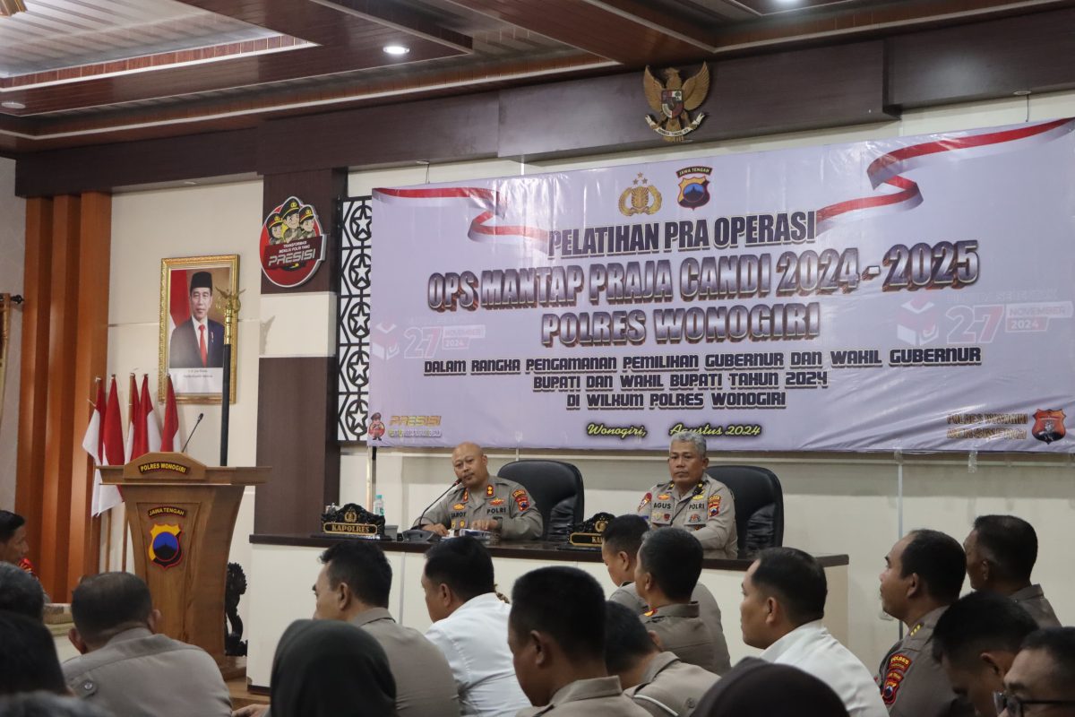 Polres Wonogiri menggelar Latihan Pra Operasi (Lat Pra Ops) Mantap Praja Candi tahun 2024 di Aula Sanika satyawada Polres Wonogiri. Jumat (23/08/24)