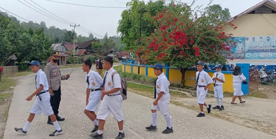 Berikan pelayanan di pagi hari Personil Polsek Sumarorong Polres Mamasa melaksanakan kegiatan pengaturan di sepanjang jalan, persimpangan, dan di depan-depan sekolah, pusat keramaian untuk mengamankan dan mengatur arus lalu lintas dipagi hari, Senin (25/7/2022).