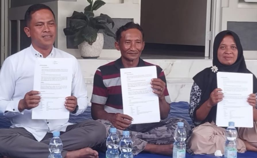 Direktur LBH Djawa Dwipa Hadi Purwanto ST SH bersama Korban Finance ADIRA Seorang Petani bernama Mahfudi dan istrinya saat Konferensi Pers