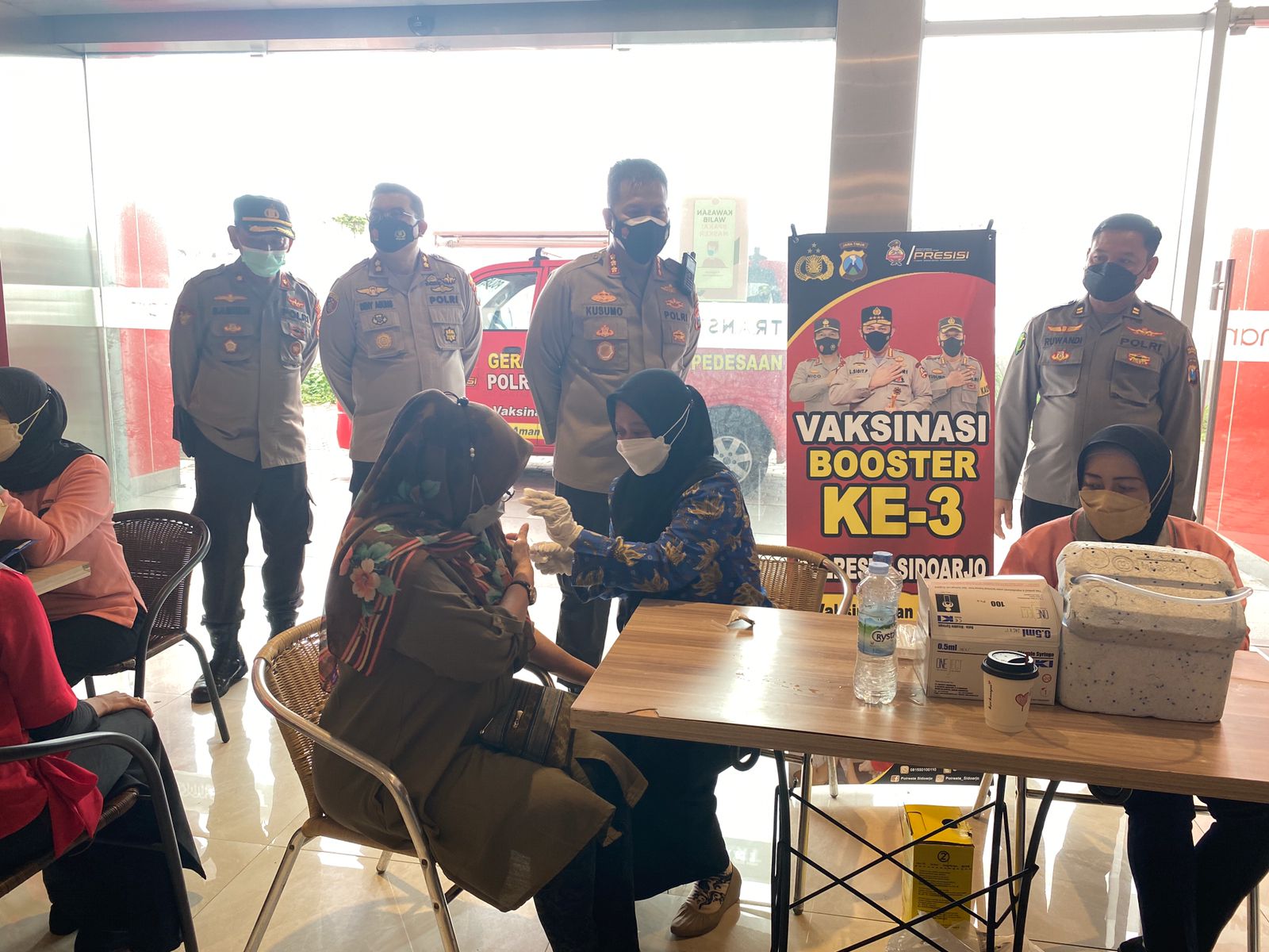 Di sudut lobi mal, Polresta Sidoarjo juga menyediakan layanan vaksinasi bagi pengunjung mal, yang belum melakukan vaksinasi dosis kedua, hingga vaksinasi booster ke tiga khususnya bagi orang lanjut usia.