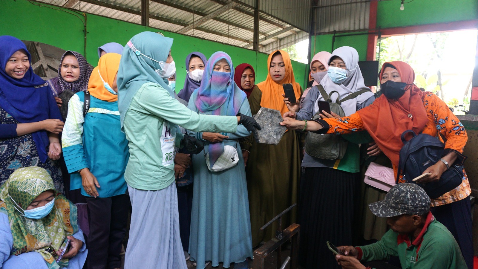 Dibantu dua rekan TPA Banjarsari, setelah adonan plastik menggumpal sempurna, saatnya untuk dicetak. Reni dengan cekatan, menggunakan sarung tangan plastik dan masker agar aman, melumuri cetakan dengan oli agar adonan eco paving block tidak menempel pada cetakan.