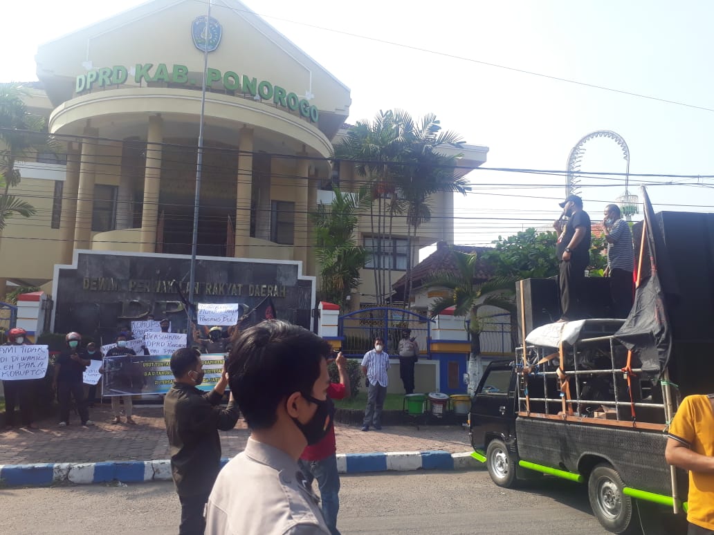 Puluhan massa yang tergabung dalam LSM Garda Wengker gelar aksi unjuk rasa di depan Kantor DPRD Ponorogo, menuntut pihak Polda Jatim agar 10 orang yang sudah ditetapkan tersangka untuk segera di meja hijaukan, pada Kamis (3/6/2021).