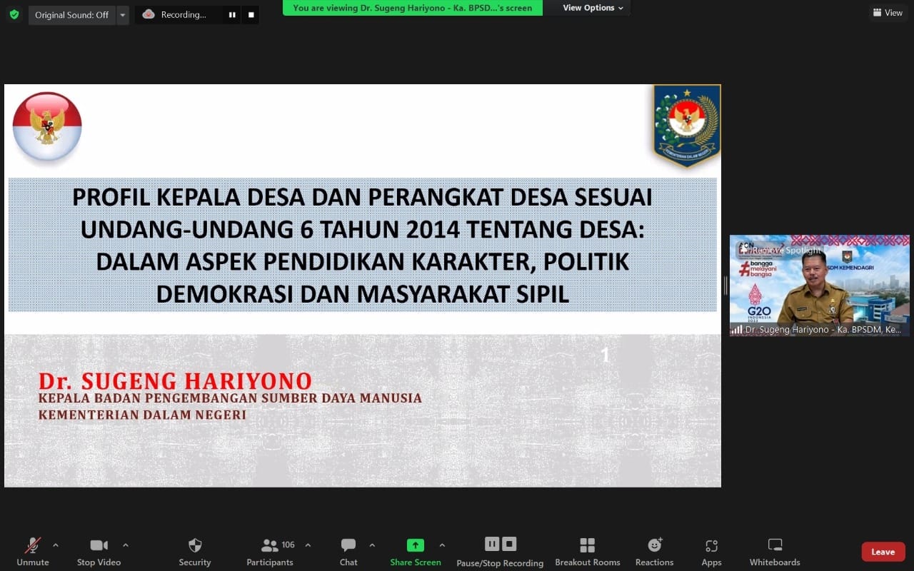 Kuliah hari kedua mempelajari tentang Profil Kepala Desa dan Perangkat Desa sesuai dengan Aspek Pendidikan Karakter, Etika, Politik Demokrasi dan Masyarakat Sipil. Sebagai narasumber Dr. Sugeng Hariyono, M.Pd. Kepala Badan Pengembangan Sumber Daya Manusia Kementerian Dalam Negeri Republik Indonesia.