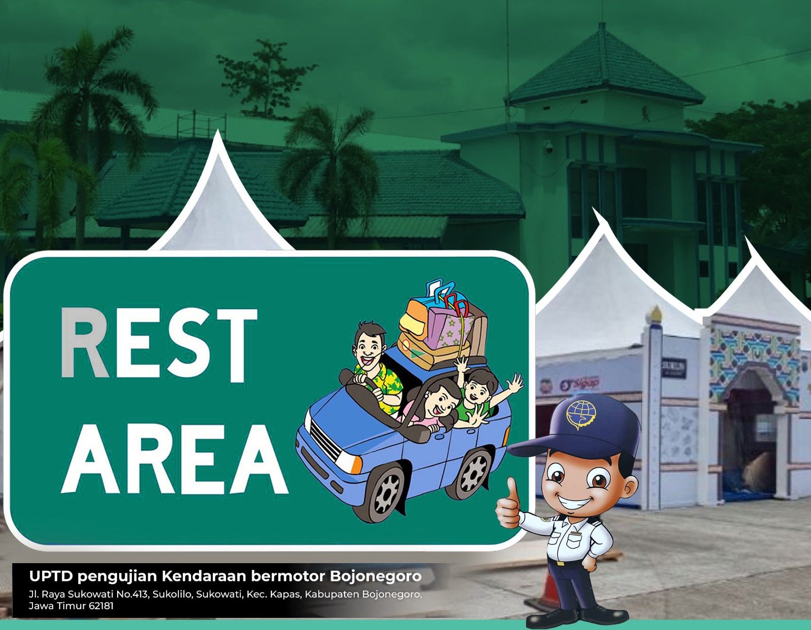 Sebagai langkah menunjang keselamatan, keamanan dan kenyamanan bagi para pemudik lebaran tahun 2023 M/1444 H, Dinas Perhubungan (Dishub) Kabupaten Bojonegoro menyediakan rest area bagi para pemudik. Rest area berlokasi di UPT pengujian kendaraan bermotor Jl. Raya Sukowati No 413 Kecamatan Kapas.