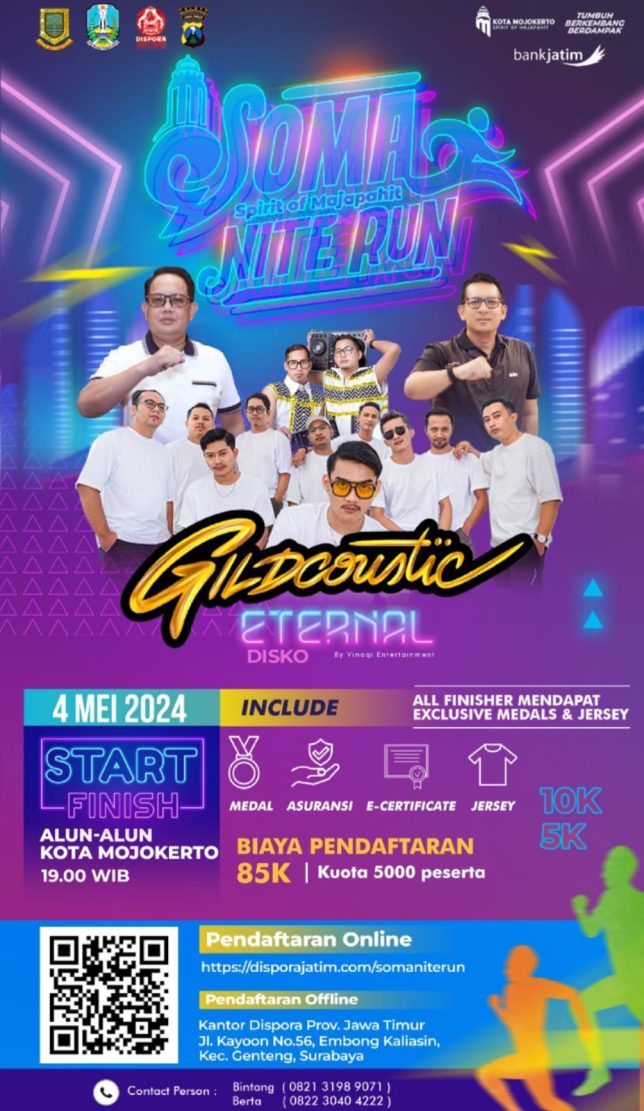 “Mari semarakkan SOMA Nite Run dan rasakan pengalaman baru mengikut SOMA Nite Run dengan menggaungkan Spirit of Mojopahit Kota Mojokerto. Pasti Seru Pasti Asyik. Sampai jumlah di tempat acara,” pungkas Mas Pj Wali Ali Kuncoro. (Kartono)