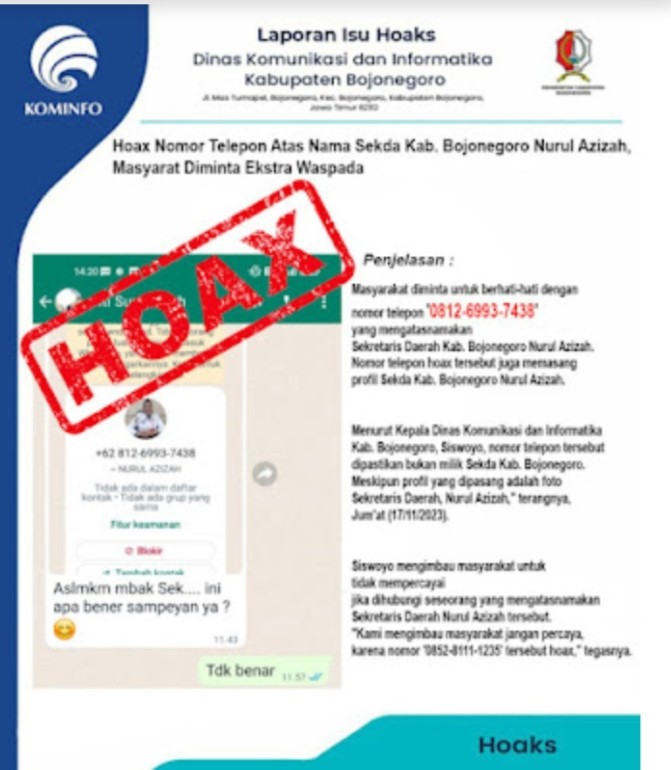 Kepala Dinas Kominfo Bojonegoro, Siswoyo, menegaskan bahwa pesan yang beredar tersebut adalah hoaks. “Informasi tersebut tidak benar. Kami sudah memastikan bahwa itu adalah hoaks, dan kami mengimbau agar masyarakat tidak mudah terpancing oleh penipuan semacam ini,” ujarnya Jumat (17/11/2023)