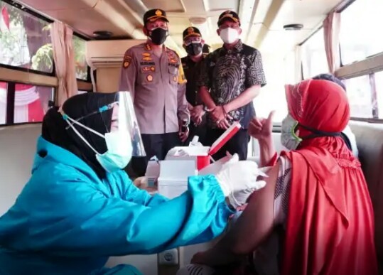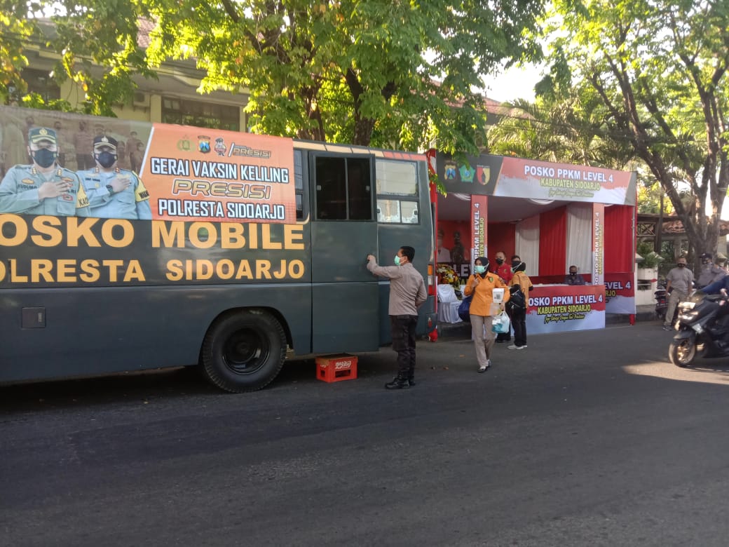 Polresta Sidoarjo membuat terobosan untuk melayani Vaksinasi Covid-19 bagi masyarakat. Dengan menyiapkan layanan bus Gerai Vaksinasi Mobile Presisi Polresta Sidoarjo. Target vaksinasi yang dilakukan sebanyak 50 dosis kepada masyarakat perhari.