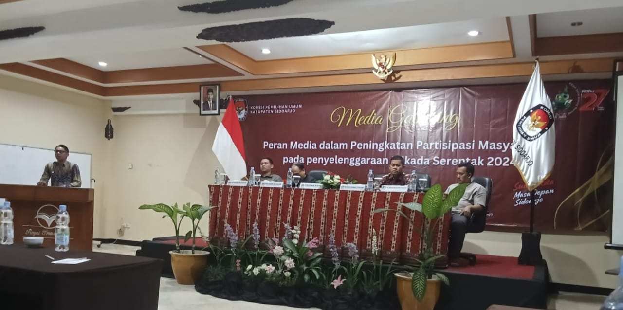 Komisi Pemilihan umum ( KPU ) Kabupaten Sidoarjo menggelar Media Gathering sukseskan Pilkada Sidoarjo, menjelang penyelenggaraan pemilu 2024 yang digelar hari ini, di Royal Hotel Tretes Jumat ( 26/07/2024) dengan tema ” Peran Media dalam peningkatan Partisipasi masyarakat pada penyelenggaraan Pemilu 2024″.