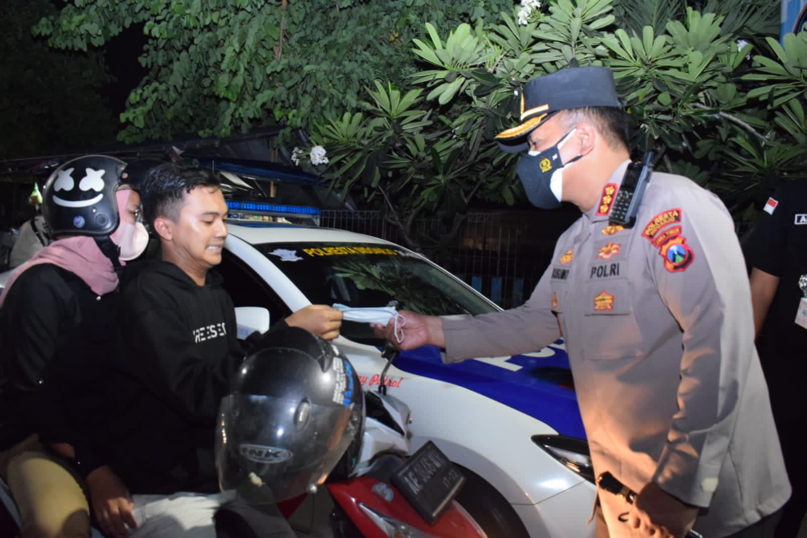 Edukasi protokol kesehatan dan tertib lalu lintas, seperti berlangsung di Pos Polisi P1, Waru, Sidoarjo.