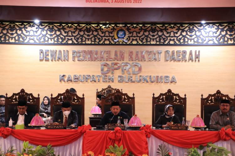 Bupati Andi Muchtar Ali Yusuf bersama Wakil Bupati Andi Edy Manaf menghadiri rapat paripurna DPRD Kabupaten Bulukumba dengan dua agenda yaitu persetujuan bersama 3 rancangan peraturan daerah dan penyerahan KUA/PPAS APBD tahun anggaran 2023, pada Rabu. 3 Agustus 2022.