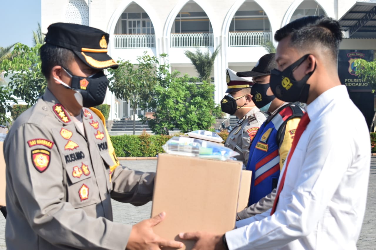Langka cepat untuk menunjang kesehatan anggota Polri dan ASN, Kapolresta Sidoarjo Kombes Pol. Kusumo Wahyu Bintoro salurkan paket kesehatan bagi anggota Polri dan ASN di lingkup Polresta Sidoarjo serta Polsek jajaran, dalam apel Senin (26/7/2021) pagi di Mapolresta Sidoarjo.