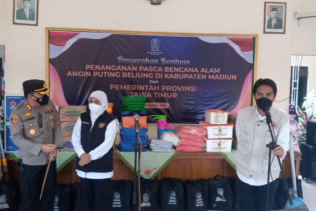 Gubernur Jawa Timur Khofifah Indar Parawangsa Mendatangi langsung korban terdampak angin puting beliung di desa sidomulyo, kecamatan wonoasri, kabupaten madiun, Jum’at 17/12/2021