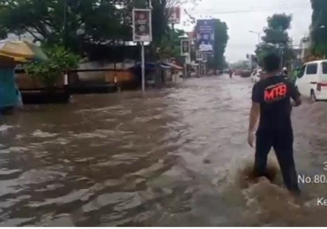 Akibatnya meski intensitas hujan tidak terlalu lama, namun nampaknya menimbulkan banjir hingga memacetkan arus lalu lintas. (San/Dany)