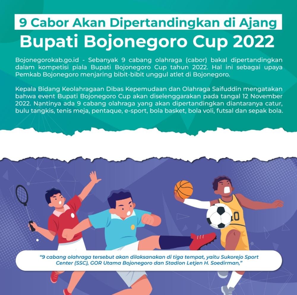 Kepala Bidang Keolahragaan Dinas Kepemudaan dan Olahraga (Dinpora) Saifuddin mengatakan bahwa event Bupati Bojonegoro Cup akan diselenggarakan pada tangal 12 November 2022. Nantinya ada 9 cabang olahraga yang akan dipertandingkan diantaranya catur, bulu tangkis, tenis meja, pentaque, e-sport, bola basket, bola voli, futsal dan sepak bola.