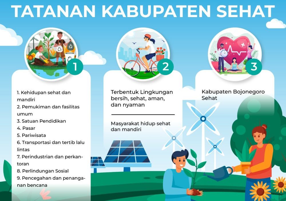 Untuk sembilan tatanan Kabupaten Sehat dimaksud diantaranya, pertama kehidupan sehat dan mandiri; kedua permukiman sehat; ketiga pendidikan sehat; keempat pasar sehat; dan kelima pariwisata sehat.