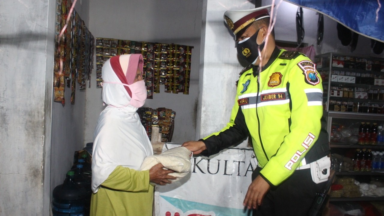 Pantauan Humas Polres Jember, Mobil Patroli Polisi yang mengangkut ratusan paket sembako khusus menyasar kawasan sekitar jalan yang dilakukan penyekatan. Sejumlah PKL yang terdampak penutupan akses jalan, seperti di Simpang 4 Mangli dan Simpang 4 Sukorejo mendapat jatah bantuan sembako.