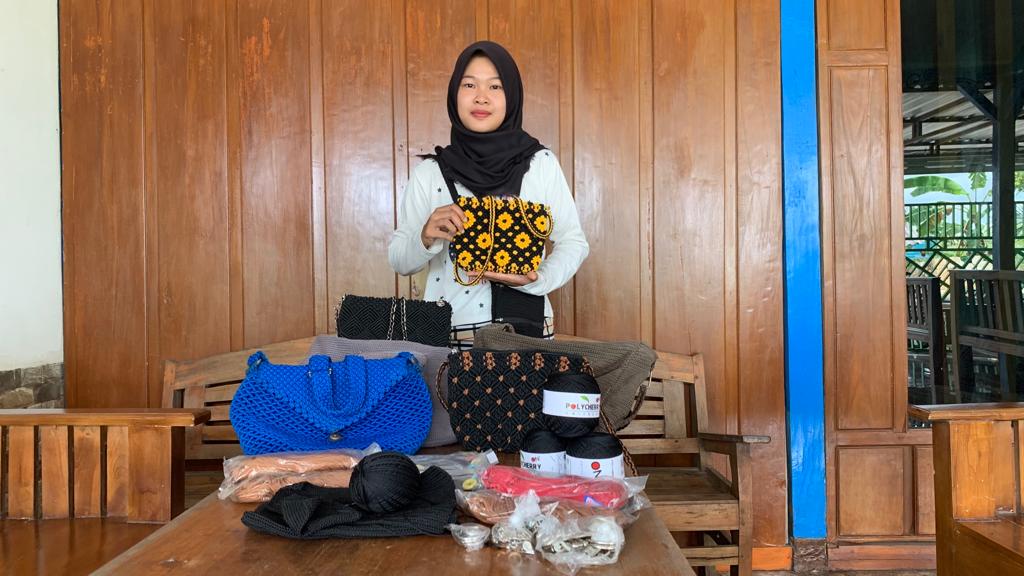 Keterbatasan tidak lantas membuat Nia Sari (20) warga Desa Gamongan Kecamatan Tambakrejo Kabupaten Bojonegoro Jawa Timur berhenti berkreasi. Ia dengan tekun membuat kerajinan tas yang terbuat dari benang rajut. Hasil jerih payahnya kini terbayar dengan pundi uang yang masuk dari penjualan karyanya.