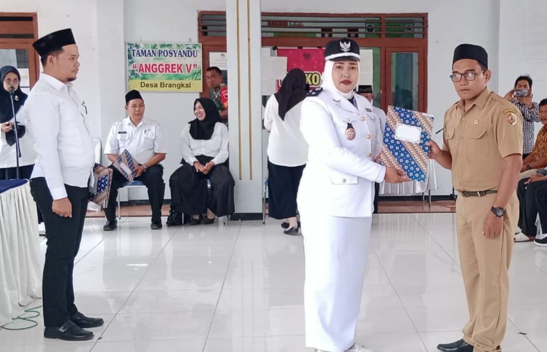 Kepala Desa Brangkal Kecamatan Sooko Nur Ely Suryani, S.Pd, yang akrab disapa Ning Lurah Brangkal ini Melantik dan mengambil sumpah jabatan Muhammad Nasrullah Sebagai Kaur Keuangan Desa Brangkal, di Pendopo Balai Desa Brangkal Kecamatan Sooko Kabupaten Mojokerton, Rabu pagi. ( 25 / 10 / 2023 ).