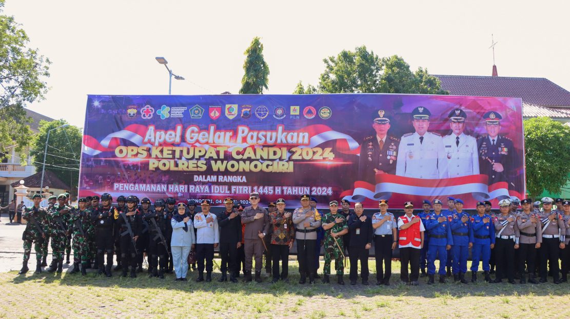 Sebagai awal ditandainya dumuali Operasi Ketupat Candi 2024, Polres Wonogiri laksanakan apel gelar pasukan pengamanan mudik balik lebaran 2024 di alun-alun Giri Krida Bakti Wonogiri, Kamis (4/4/2024)