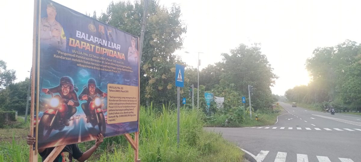 Antisipasi balap liar, Polsek Pracimantoro Polres Wonogiri melaksanakan pemasangan spanduk imbauan OPS Keselamatan Candi 2025 tentang larangan balap liar.