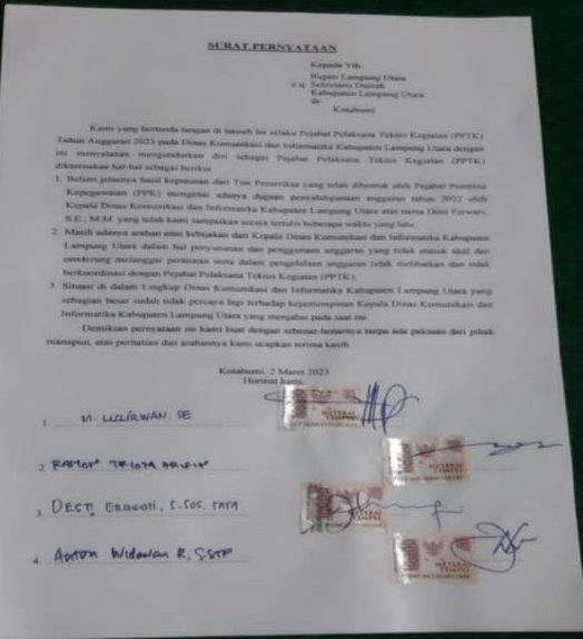 Adapun Mosi tidak percaya tersebut disampaikan melalui surat yang ditujukan kepada Bupati dan Wakil Bupati Lampung Utara, guna dilakukan evaluasi terhadap ke empat ASN Diskominfo tersebut untuk diberikan sanksi tegas, sebab telah merusak tatanan birokrasi Pemkab hingga menuai gunjingan negatif kepemimpinan Trisula Lampung Utara (Bupati, Wakil Bupati, dan Sekda).