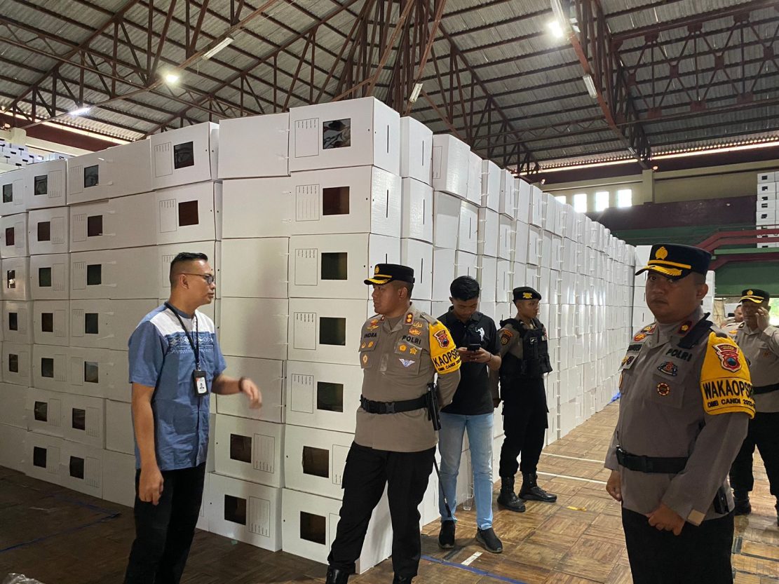 Kapolres Wonogiri, AKBP Andi Muhammad Indra Waspada Amirullah, SH., SIK, M.., MSi., melakukan pengecekan Gudang setting dan pengepakan logistik pemilu 2024 di GOR Giri Mandala Kabupaten Wonogiri, Sabtu, (27/1/2024).
