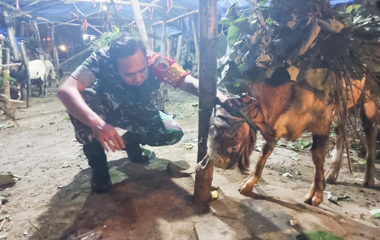 Bintara Pembina Desa (Babinsa) Koramil 05/Dander, Kodim 0813 Bojonegoro, Koptu Benny Ardi, mengecek kesehatan hewan kurban, Jum’at, (8/7/2022) malam. Kegiatan tersebut dilaksanakan di penjualan kambing yang terletak di Jalan Raden Moch Rosyid, Kecamatan Dander Kabupaten Bojonegoro.