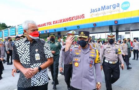 Kapolri Jenderal Listyo Sigit Prabowo didampingi Kapolda Jateng bersama dengan Gubernur Jawa Tengah (Jateng) Ganjar Pranowo beserta stakeholder lainnya meninjau langsung Pos Terpadu Gerbang Tol Kalikangkung KM 414 untuk memastikan kesiapan pelayanan mudik Lebaran 2022.