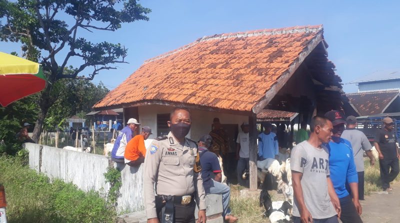 Bhabinkamtibmas Polsek Cepiring Aiptu Mochamad Annas melaksanakan kegiatan patroli dialogis dengan sasaran hewan ternak sapi dan kambing di Pasar Hewan Desa Gondang Kecamatan Cepiring Kabupaten Kendal, Senin, (8/08/2022).