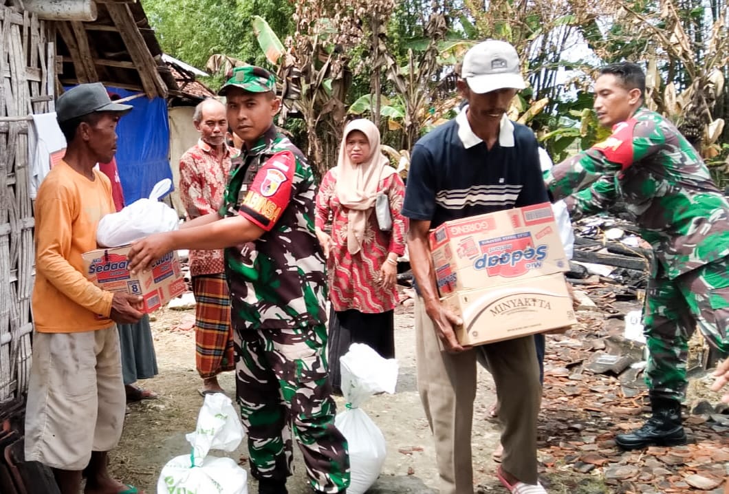 Peduli Korban Kebakaran, Babinsa Kepohbaru Bojonegoro Berikan Bantuan Sembako ke Warga