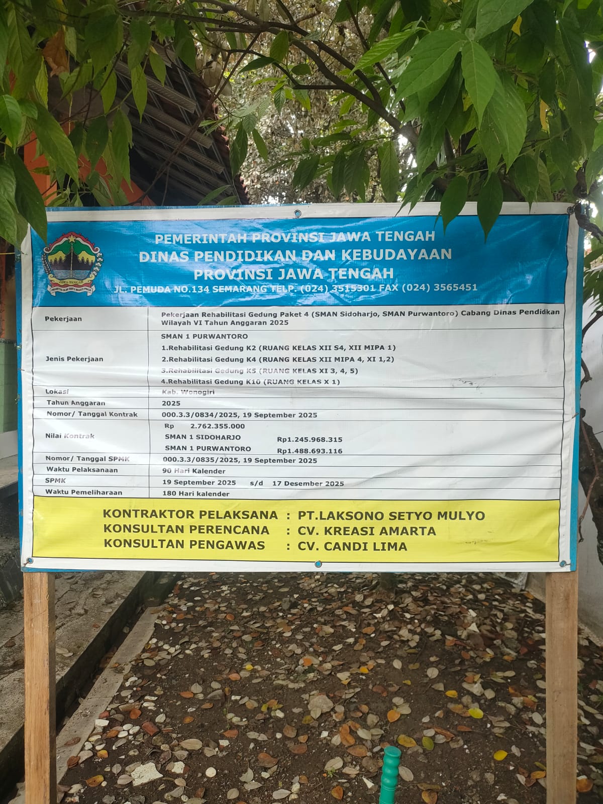 Proyek ini pakai Dana Alokasi Khusus (DAK) Dinas Pendidikan dan Kebudayaan Provinsi Jawa Tengah sebesar Rp1,4 miliar untuk Tahun Anggaran 2025, dengan durasi 90 hari kalender. Kontraktor pelaksana CV. Laksono Setyo Mulyo, perencana CV. Kreasi Amarta, dan pengawas CV. Candi Lima.
