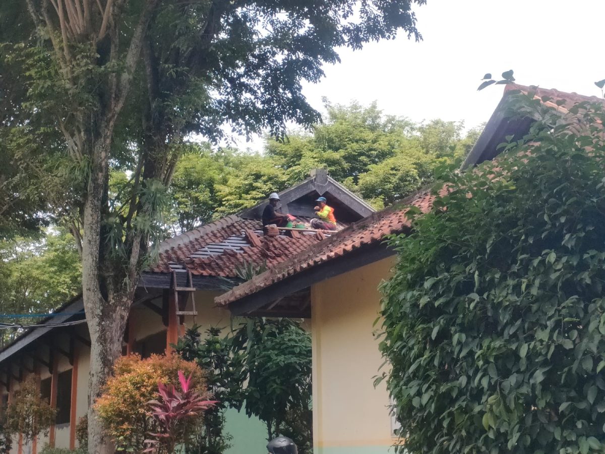 Pekerja konstruksi rehabilitasi gedung SMA Negeri 1 Purwantoro, Kecamatan Purwantoro, Kabupaten Wonogiri, terlihat bekerja tanpa alat pelindung diri (APD) saat Tim Persatuan Jurnalis Wonogiri (PJW) kunjungi lokasi Senin (17/11). Dari 11 pekerja, tak ada yang pakai helm, sarung tangan, atau sepatu safety, langgar Peraturan Menteri Tenaga Kerja Nomor PER.08/MEN/VII/2010 yang wajibkan pengusaha sediakan APD gratis sesuai SNI.