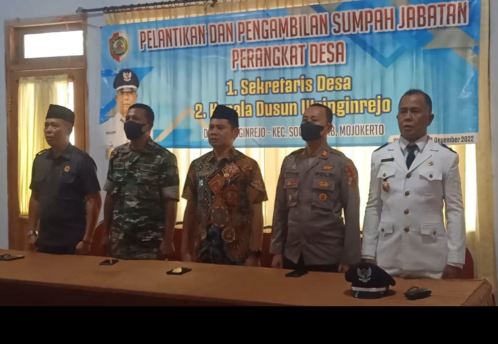 Kepala Desa Wringinrejo Kecamatan Sooko Kabupaten Mojokerto H. Suhartono, Jum’at, ( 30 / 12 / 2022 ) Melantik dan Mengambil Sumpah Jabatan Iqbal Alamsyah Pratama sebagai Sekretaris Desa ( Carik ) Wringinrejo dan Zettira Ameilliafidhoh sebagai Kepala Dusun Wringinrejo di Aula Balai Desa Wringinrejo yang dihadiri oleh Camat Sooko Masluchman, SH, MM, didampingi Kapolsek beserta Danramil Sooko.