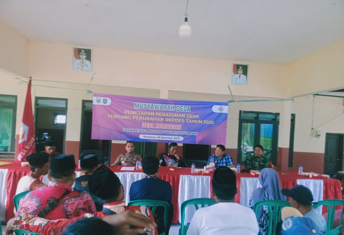 Musyawarah desa (Musdes) penetapan Rencana Kerja Pemerinatah Desa (RKPDes) perubahan tahun anggaran 2025 Digelar di desa rombasan, kecamatan pragaan, Kabupaten Sumenep. Bertempat di aula kantor desa rombasan pada hari Jumat 5 Desember 2025.