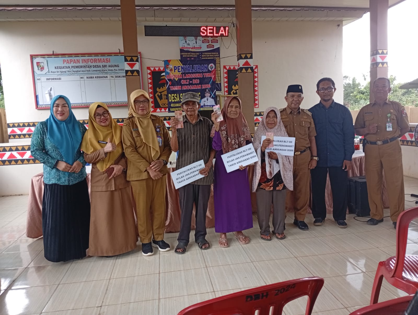 Pemerintah Desa Sri Agung, Kecamatan Sungkai Jaya, Kabupaten Lampung Utara, menyalurkan Bantuan Langsung Tunai Dana Desa (BLT-DD) triwulan pertama tahun 2026 kepada 9 Keluarga Penerima Manfaat (KPM), Senin (20/4/2026).