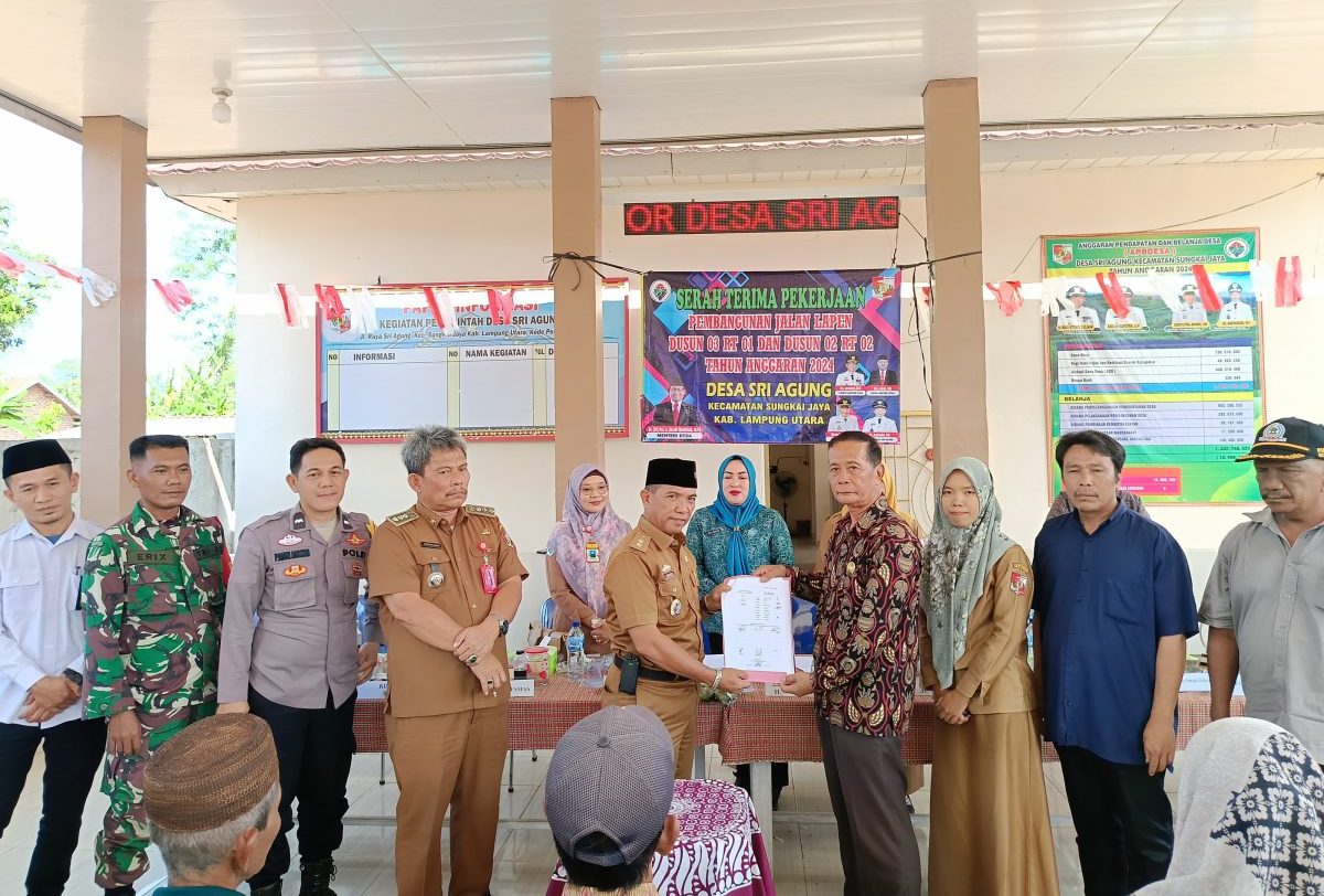 Pemerintah Desa Sri Agung Gelar Acara Setah Terima Pekerjaan Pembangunan Jalan Lapen yang Berlokasi di Dusun 3 RT 1 Dan Dusun 2 RT 2 Tahun Anggaran 2024 Desa Sri Agung, Di Kantor Desa Sri Agung Kecamatan Sungkai Jaya Kabupaten Lampung Utara, Selasa 27 Agustus 2024.