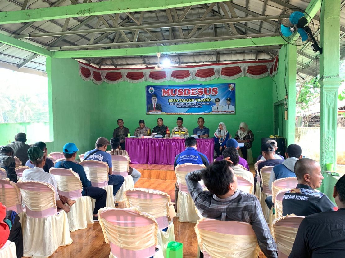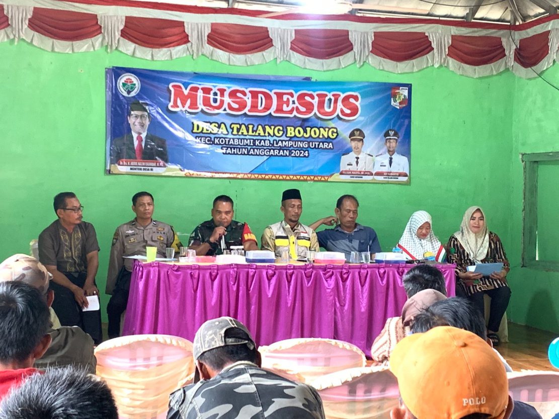 Kegiatan Musdesus tersebut di pimpin langsung oleh Kepala Desa Talang Bojong, Edi Sumantri, serta di hadiri oleh Camat Kotabumi, Nujum Masa. SE, Bhabinsa, Pelda Serma Alizi Najaya Babinkamtibnas, Aiptu Zunun Al Misri, Ketu BPD Nursalam Spdi , PDTI Rini Amelia, PLD Endang Nopita, Pendamping Desa, LPM, Aparatur Desa, , RT dan Tokoh Masyarakat Desa Talang Bojong.