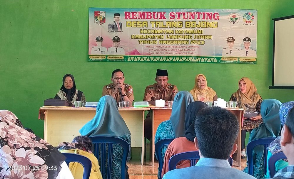 Pemerintah Desa Talang Bojong Kecamatan Kotabumi,Kabupaten Lampung, melaksanakan rembuk stunting, kegiatan tersebut berlangsung dibalai desa talang bojong. Selasa ( 25/07/2023 ).