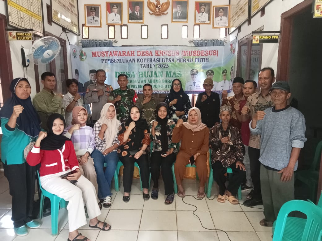 Pemerintah Desa Ujan Mas Kecamatan Abung Barat. Kabupaten Lampung Utara menggelar Musyawarah Desa Khusus (Musdes) dalam rangka pembentukan koperasi desa merah putih sesuai dengan pedoman instruksi presiden (inpres) nomor 9 tahun 2025 dan Edaran Kemendesa PDT nomor 6 tahun 2025 serta petunjuk pelaksanaan Kemenkop.