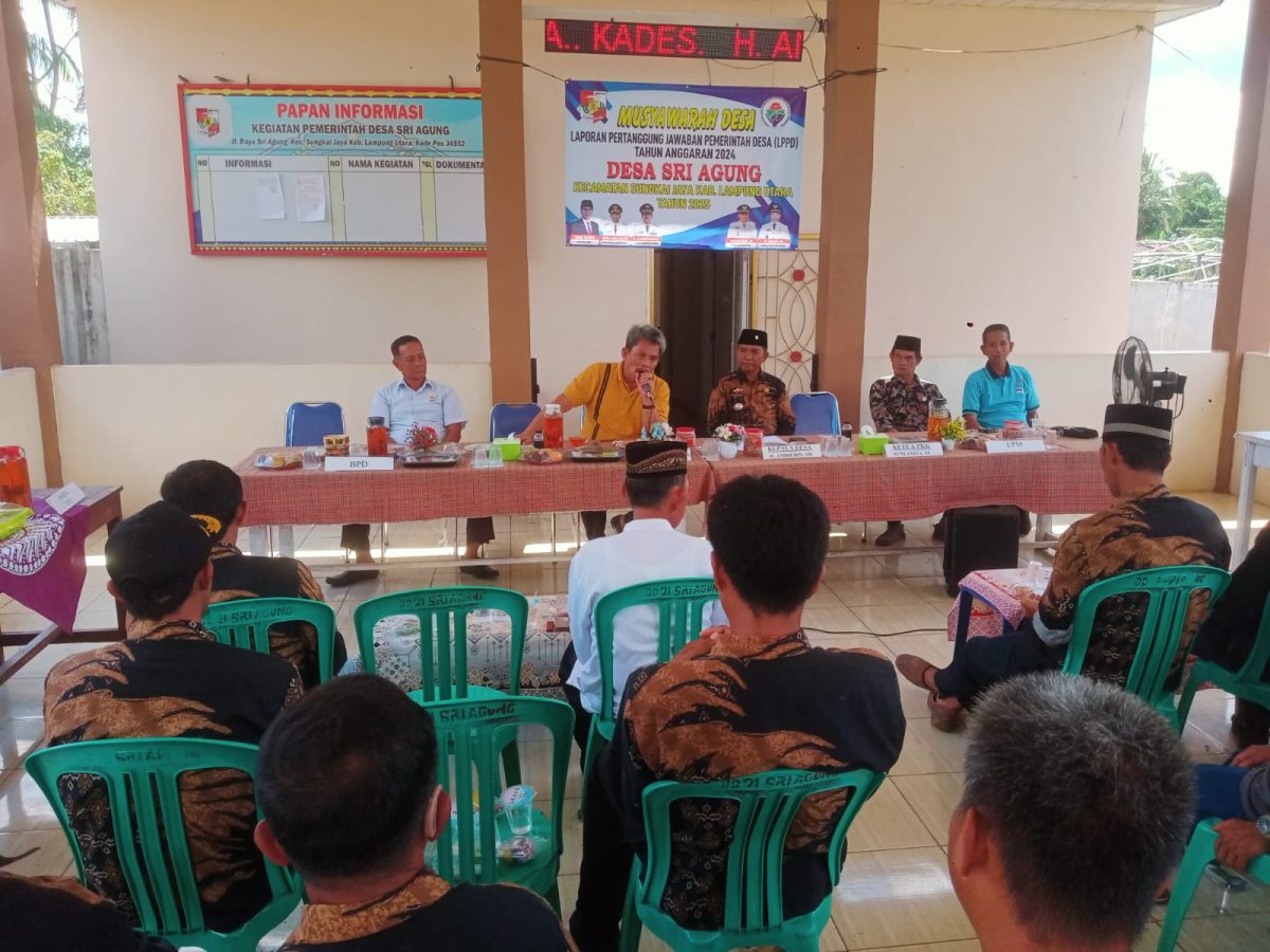 Pemerintah Desa Sri Agung Kecamatan Sungkai Jaya, Kabupaten Lampung Utara melaksanakan Musyawarah Desa (Musdes) membahas Laporan Realisasi Pertanggungjawaban Anggaran Pendapatan dan Belanja Desa (APBDes) Tahun 2024. Acara berlangsung di Balai Desa Sri Agung. Jum’at 28 Febuari 2025.