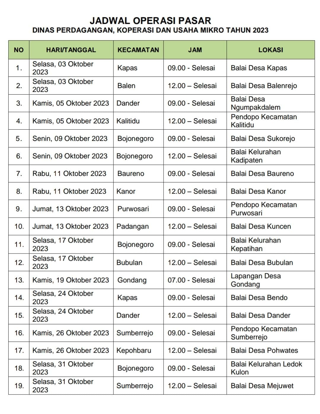 Pemerintah Kabupaten Bojonegoro melalui Dinas Perdagangan, Koperasi dan Usaha Mikro bekerjasama dengan Bulog Sub Divre Bojonegoro mengadakan ‘Operasi Pasar’ untuk memantau penjualan komoditas beras. Kegiatan ini direncanakan berlangsung selama Oktober 2023.