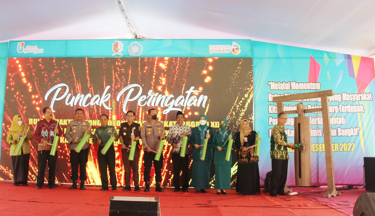 Pemerintah Kabupaten Bojonegoro menggelar puncak peringatan Bulan Bhakti Gotong Royong Masyarakat (BBGRM) XIX dan Hari Kesatuan Gerak (HKG) PKK Ke-50 Kabupaten Bojonegoro Tahun 2022. Kegiatan dengan tema ‘Melalui Momentum BBGRM, Kita Wujudkan Bojonegoro Terdepan Pembangunan Berkelanjutan Mendukung Optimis Jatim Bangkit’ dilaksanakan di Lapangan Desa Jatigede Kecamatan Sumberrejo, Kamis (8/12/2022).