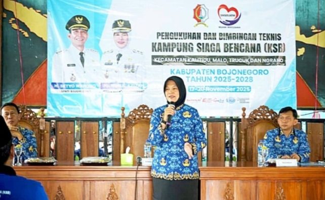 Melalui Dinas Sosial, Pemkab Bojonegoro melalui menyelenggarakan Pengukuhan dan Bimbingan Teknis Kampung Siaga Bencana (KSB) Tahun 2025-2028 guna peningkatan kapasistas anggota tim KSB melalui bimbingan teknis dan simulasi penanganan bencana, di Balai Desa Pungpungan Kalitidu, pada Senin (17/11/2025).