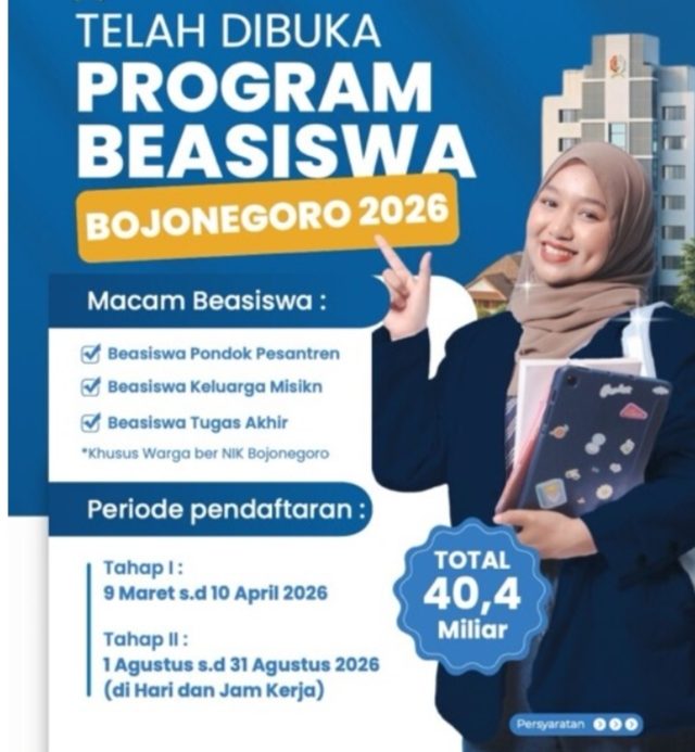 Pemerintah Kabupaten Kabupaten Bojonegoro mengalokasikan anggaran sebesar Rp40,4 miliar untuk Program Beasiswa Tahun 2026 yang segera dibuka. Dukungan anggaran tersebut menjadi langkah nyata pemerintah daerah dalam meningkatkan kualitas pendidikan sekaligus memperluas akses bagi warga Bojonegoro agar dapat melanjutkan studi tanpa terkendala biaya.