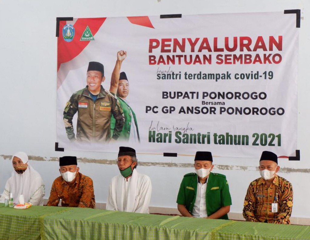 Pemerintah Kabupaten Ponorogo bersama Gerakan Pemuda (GP) Ansor cabang Ponorogo, menyalurkan bantuan sembako kepada santri terdampak covid-19. Penyaluran bantuan ini masih dalam rangkaian hari santri tahun 2021, Kamis (2/12/2021).