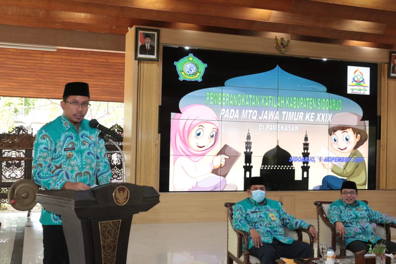 Kabupaten Sidoarjo mengirimkan 70 orang kafilah pada MTQ Jawa Timur ke XXIX yang digelar di Kabupaten Pamekasan. Pagi tadi mereka diberangkatkan Bupati Sidoarjo H. Ahmad Muhdlor Ali S.IP dipendopo Delta Wibawa Senin, (1/11). Terdapat 52 peserta yang akan mengikuti 44 cabang dalam MTQ ke 29 Jatim tahun ini. Selebihnya official, pendamping, pembina dan driver.