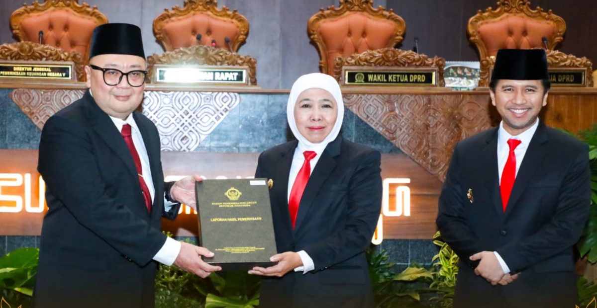 Badan Pemeriksa Keuangan (BPK) RI kembali memberikan predikat Opini Wajar Tanpa Pengecualian (WTP) pada Laporan Hasil Pemeriksaan (LHP) atas Laporan Keuangan Pemerintah Daerah (LKPD) Pemprov Jatim Tahun Anggaran 2024 bertempat di Sidang Paripurna DPRD Jatim, Surabaya, Kamis (24/4/2025).