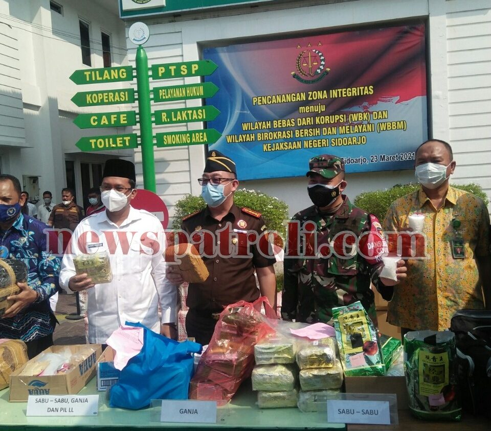 Keseriusan Forum Koordinasi Pimpinan Daerah (Forkopimda) Kabupaten Sidoarjo dalam menangani peredaran Narkoba dibuktikan dengan keberhasilan pengungkapan kasus Narkoba yang terjadi di Sidoarjo. Pagi tadi, barang bukti kasus Narkoba tersebut dimusnahkan di kantor Kejaksaan Negeri Sidoarjo, Rabu, (9/6). Selain barang bukti Narkoba jenis sabu-sabu, ekstasi, pil double L, ganja dan tembakau gorila, juga dilakukan pemusnahan barang bukti rokok ilegal dan hp. Pemusnahan disaksikan oleh Forkopimda Sidoarjo diantaranya Bupati Sidoarjo H. Ahmad Muhdlor Ali S.IP, Kepala Kejaksaan Negeri Sidoarjo Arif Zahrulyani serta Dandim 0816 Sidoarjo Letkol. Inf. Mohamad Iswan Nusi. Hadir pula kepala BNN Sidoarjo serta kepala Lapas Sidoarjo.