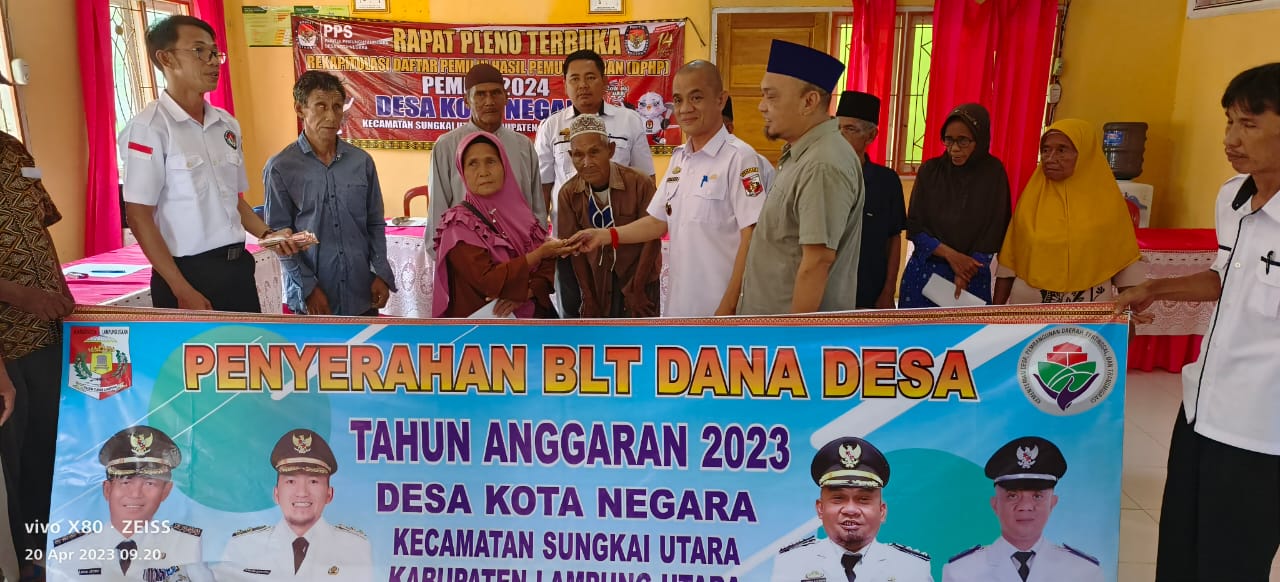 Pemerintah Desa (pemdes) Kota Negara, Kecamatan Sungkai Utara, Kabupaten Lampung Utara, Salurkan Bantuan Langsung Tunai Dana Desa (BLT DD) Triwulan pertama. di kantor desa Nota Negara. Kamis ( 20/04/2023 ).